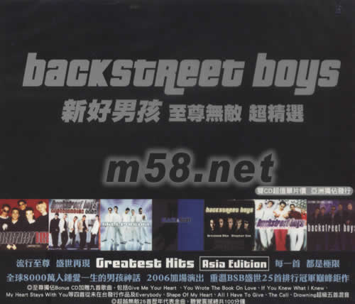 新好男孩 至尊無敵 超精選 臺版(m58.net) 流行至尊 盛世再現 GREATEST HITS ASIA EDITION 每一首都是極限 全球8000萬人鐘愛一生的男孩神話 2006加場演出 重溫BSB盛世25首排行冠軍巔峰巨作 至尊獨占Bonus CD加贈九首歌曲 包括四首從未在臺發行作品及超級五首混音 超越無敵25首歷年代表金曲 聽覺震撼總共100分鐘 空前絕后男孩盛況 十項全能神話再現 一天賣出超過百萬張演唱會門票 第一組連續兩張專輯全美單周銷售大破百萬 全球單周最暢銷歷史紀錄:Black & Blue專輯(500萬張) Black & Blue世界巡回演唱創三億五千萬美金收入 披頭四后唯一兩張專輯全球大破3000萬出貨量團體 連續三年勇奪四項世界音樂獎 97年迄今唱片和演唱會收入最高藝人 金氏世界紀錄最暢銷男孩團體 史上最暢銷男孩團體專輯Millennium Q雜志評選史上最偉大50組團體(#22名)