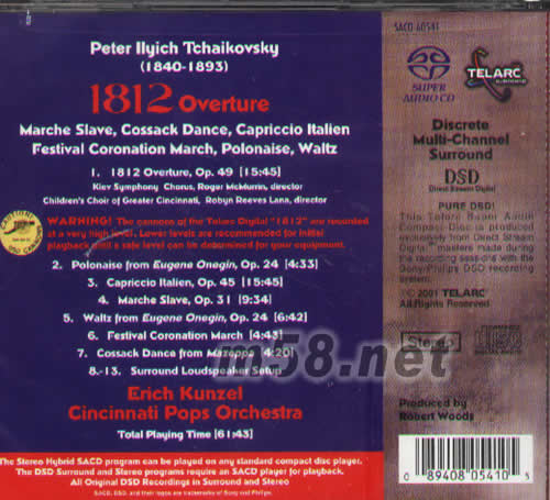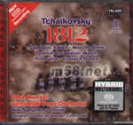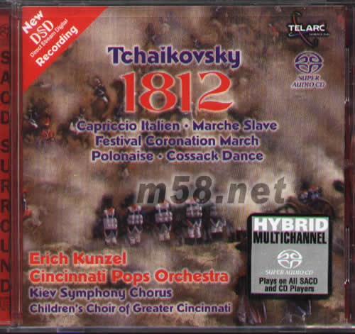 TCHAIKOVSKY 1812 OVER TURE 孔澤爾 - 柴可夫斯基:1812序曲 混合層多聲道SACD(m58.net) 2001年初,Telarc唱片公司第三次出版發行了孔澤爾指揮灌錄的《柴可夫斯基:1812序曲》,而且是多聲道SACD唱片。 柴科夫斯基在1880年寫的《1812序曲》,全名為《用于莫斯科救主基督大教堂的落成典禮,為大樂隊而作的1812年莊嚴序曲》。這首曲是柴科夫斯基應他的老師魯賓斯坦之請而作,目的是慶祝莫斯科救主基督大教堂的重建(這座教堂曾在1812年法俄戰爭中被戰火焚毀)。 《1812序曲》是根據史實寫成的一部管弦樂作品。柴科夫斯基在這首序曲中層次分明地敘述了1812年的這一事件,包括俄羅斯人民原來的和平生活和隨后發生的不安和騷亂,俄法兩軍的會戰,以及最后俄國擊潰法軍,俄羅斯人民慶祝勝利的狂歡情景等。 新版的《柴可夫斯基:1812序曲》的整體音樂表現是寬廣、通透、細致。由于采用了先進的多聲道錄音技術,又彌補了老版清晰度稍差的毛病,因此整體的聲效大為提升。唱片的錄音長度為60分23秒,比老版長了20多分鐘。