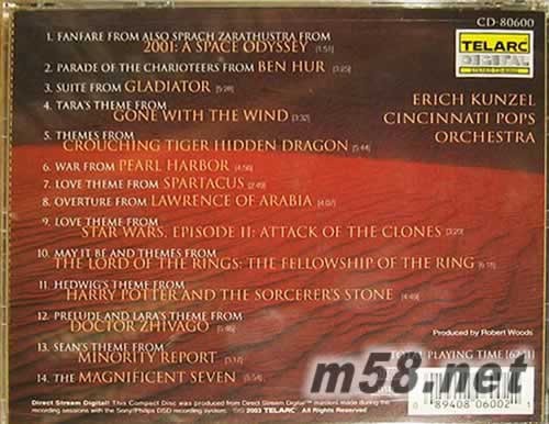 01.FANFARE FROM ALSO SPRACH ZARATHUSTRA FROM/2001:A SPACE ODYSSEY 02.PARADE OF THE CHARIOTEERS FROM BEN HUR 03.SUITE FROM GLADIATOR 04.TARA’S THEME FROM GONE WITH THE WIND 05.THEMES FROM CROUCHING TIGER HIDDEN DRAGON 06.WAR FROM PEARL HARBOR 07.LOVE THEME FROM SPARTACUS 08.OVERTURE FROM LAWRENCE OF ARABIA 09.LOVE THEME FROM STAR WARS EPISODE II:ATTACK OF THE CLONES 10.MAY IT BE AND THEMES FROM THE LORD OF THE RINGS:THE FELLOWSHIP OF THE RING 11.HEDWIG’S THEME FROM THE LORD OF THE RINGS:THE SORCERER’S STONE 12.PRELUDE AND LARA’S THEME FROM DOCTOR ZHIVAGO 13.SEAN’S THEME FROM MINORITY REPORT 14.THE MAGNIFICENT SEVEN