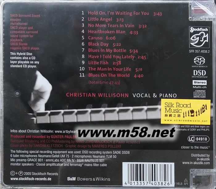 HOLD ON(請等一等) SACD(m58.net) 老虎魚唱片直刻發燒SACD 暫停一會 由藍調鋼琴唱作人姬絲奵,韋里臣(Christina Willisohn)唱出多首真摯感人的歌曲.由大師級錄音師GUNTER PAULER 親自監制及錄音。利用B &W Nautilus801 作監聽,音色效果絕對發燒級水準。