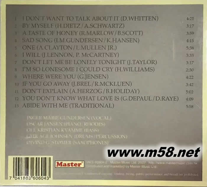 动人心情 BY MYSELF(m58.net) 著名实力派女歌手INGER MARIE GUNDERSEN 茵珈最新专辑,再次以其节奏蓝调韵味献唱出多首名曲。 以ROD STEWART名作I DON;T WANT TO TALK ABOUT IT作开始,其深情沉厚的歌声唱出一字一句的悲情往事,触动心灵。U2经典金曲ONE 。 茵珈的女声版本更添韵味,昔士风带出感性的情发泄。 揧OU DON;T KNOW WHAT LOVE IS ?#31616;单的以结他伴唱,迷醉的歌声长留心底,历久难忘。重新演绎披头四名曲?I WILL?#12290;茵珈以最真挚感人声线献唱,优美动人。 通透靓绝的录音突显出人声、乐器的层次感,敲击的鼓皮声,人声的圆润立体是试人声及音效的必然首选。