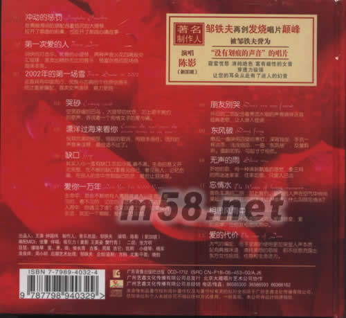 陳影 [媚影](m58.net) 著名制作人鄒鐵夫 再創發燒唱片顛峰 突破以往風格 采用不同的編配和制作磁性的女聲極具穿透力 是一張被譽為 "沒有劃痕的聲音"的唱片 甜蜜憂愁 清純絕色 富有磁性的女聲 穿透力極強讓您的耳朵從此有了迷人的幻音