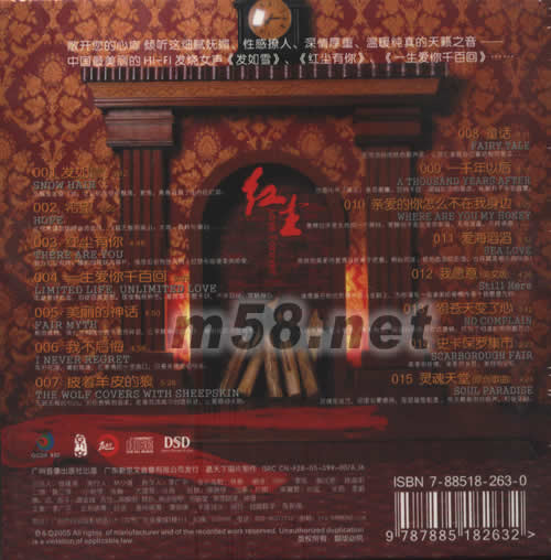 價格為估,以實到貨為準! 雷麗 紅塵DSD(m58.net) 這張發燒專輯出自國內著名音樂制作人李廣平先生和其夫人、作曲家林靜之手,知名音樂家王華的編曲也為專輯的成功寫下重要的一筆,除此之外還請來多位在樂界頗具影響力的樂手如黃江琴、付娜、黃金城、繆曉錚等鼎力相助,使這張專輯的質量得到有力保證。歌手雷麗是廣州星海音樂學院四年級的學生,曾獲首屆廣州市文化局主辦的羊城新秀青年歌手電視大獎賽第二名;05年在國內和東南亞地區都頗具影響力的福建東南衛視"銀河之星大擂臺"歌唱比賽中以一曲《靈魂天堂》藝驚四座,榮獲首屆擂主稱號;并多次參加廣東電視臺和中央電視臺的各種晚會演出。她能把一首你印象中的老歌唱出脫胎換骨的新感覺!她的歌聲有一種內在的溫暖與祥和、平安與滋潤,貼近皮膚,直達心臟,持久而真切,澄澈而清麗,讓我們在心里久久回味。