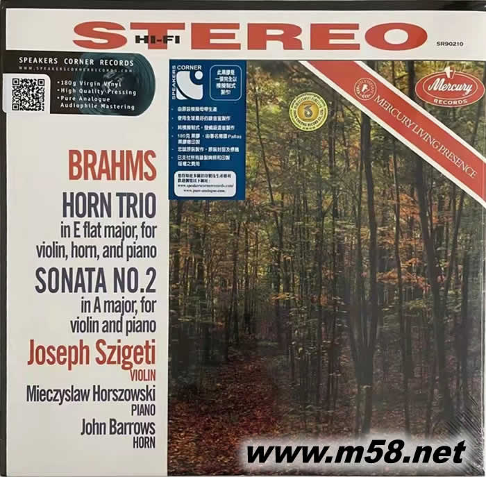 勃拉姆斯:小提琴奏鳴曲/圓號 鋼琴三重奏 BRAHMS HORN TRIO 黑膠(m58.net) 美國MERCURY LIVING PRESENCH經(jīng)典錄音,圓號演奏抒情,音色圓潤,小提琴冷靜清晰,鋼琴音色結(jié)構(gòu)厚重,氣勢龐大。加上默契的配合,180克黑膠。