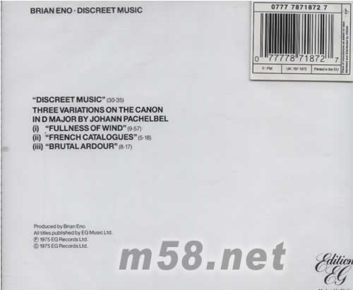 價格為估,以實到貨為準! DISCREET MUSIC(m58.net) 他是環境音樂的先鋒,70年代當過glam-rock搖擺斗士,曾為無數流行樂手創造過流行榜大熱,也是多媒體藝術家,音響科技的實驗性發明家,而且于80年代開始不停倡導world beat……單這樣數一數,已看到Brian Eno在眾多音樂紀元和范疇所留下過的影響,由punk到glam到techno到new age到ambient,處處都看到Brian Eno的蹤跡。