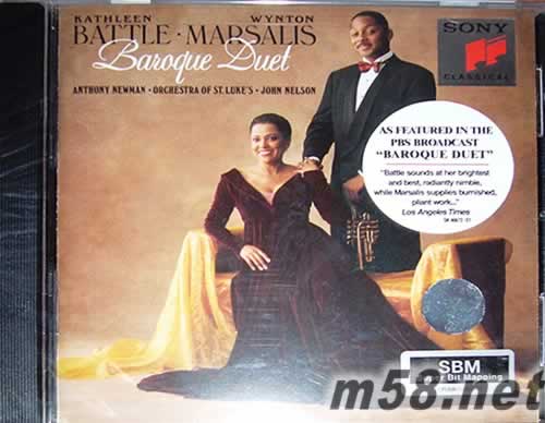 價格為估,以實到貨為準! 巴洛克二重唱/BATTLE(m58.net) 這張唱片可把它列入“奇珍異寶”系列,音樂:清新可喜,音響:舞臺臨場感傳神,錄音同樣絕頂清純,在優秀的系統里,真的會讓你忘了今夕是何夕。身處繁忙的工作環境,人生的至樂也不過如此而已! 《巴洛克美聲小號二重奏》曾在1992年奪得美國“公告牌”年度銷量排行榜古典類第二名。由一男一女兩位黑人音樂家作主角的這張古典音樂唱片, 在種族岐視還比較嚴重的美國獲得這么大的成功實屬罕見。溫頓·馬沙利斯現已成為橫跨古典、爵士兩界的大師, 率林肯中心樂團訪華時亦大受歡迎。他對小號演奏的鉆研下了很大功夫, 演出曲目范圍之廣超過同輩小號演奏家, 是典型的全才音樂人。芭特爾自從1987年在卡拉揚指揮的那次新年音樂會上一展歌喉后, 星運高照, 她出谷黃鶯般的脫俗音色注定她成為演唱巴羅克聲樂曲的一流高手。片名中的“二重奏”字眼, 表明與人聲搭配的小號不是次要角色, 而是與人聲平起平座的獨立聲部。巴羅克時期的小號是重要的旋律性樂器, 常被作曲家用于表現富麗堂皇的音響場面, 地位遠在其他樂器之上。碟中所選的曲目, 當中均由閣唱歌手詮釋。以小號與人聲對答, 是對人聲技巧性的極度考驗, 同時對小號的演奏難度也要求極高。在此張唱片中芭特爾與馬沙利斯再現出十七、十八世紀華美輝煌的音樂美學概念, 人聲的花腔變化自如, 時而直上云宵 時而魚潛水底;小號盡顯明亮的音色, 且穿透力無比強勁, 快速吹奏段落讓人昕得心醉神馳。兩者的配合主次位置不時交接, 與后世聲樂創作手法有天淵之別, 突出與世無爭的精致優雅, 柔情脈脈的田園詩意貫穿始終。這是巴羅克音樂和聲樂、管樂愛好者的必備天碟。