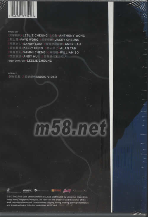 AUDIO CD 01. 芳華絕代+LESLIE CHEUNG 02. 約會+ANTHONY WONG 03. 花生騷+FAYE WONG 04. 相愛很難+JACKY CHEUNG 05. 兩個女人+SANDY LAM 06. 彈彈琴跳跳舞+ANDY LAU 07. 夏娃夏娃+KELLY CHEN 08. 路人甲乙+ALAN TAM 09. 單身女人+SAMMI CHENG 10. 兩粒糖+WILLIAM SO 11. 先慌夜談+ANDY HUI 12. 芳華絕代亂世佳人lego version+LESLIE CHEUNG VIDEO CD 01. 制作花絮 02. 芳華絕代 Music Video