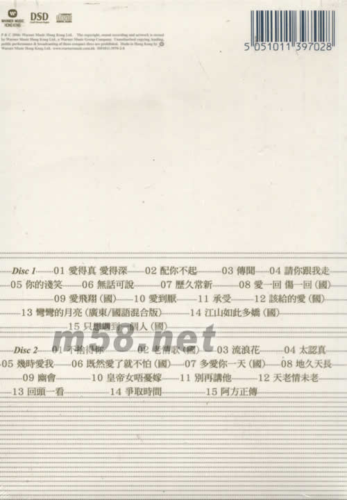 DISC 1 1.愛得真 愛得深 2.配你不起 3.傳聞 4.請你跟我走 5.你的淺笑 6.無話可說 7.歷久常新 8.愛一回 傷一回(國) 9.愛飛翔(國) 10.愛到厭 11.承愛 12.該給的愛(國) 13.彎彎的月亮(廣東/國語混合版) 14.江山如此多嬌(國) 15.只想遇到一個人(國) DISC 2 1.不捨得你 2.老情歌(國) 3.流浪花 4.太認真 5.幾時愛我 6.既然愛了就不怕(國) 7.多愛你一天(國) 8.地久天長 9.幽會 10.皇帝女唔夏嫁 11.別再講他 12.天老情未老 13.回頭一看 14.爭取時間 15.阿方正傳