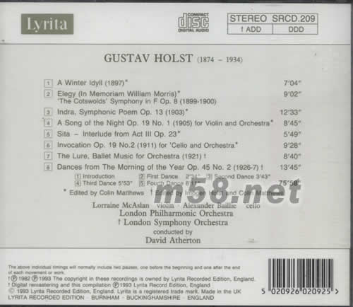 1.A WINTER LDYLL(1897) 2.ELEGY (IN MEMORIAM WILLIAM MORRIS) THE COTSWOLDS SYMPHONY IN F OP.8(1899-1900) 3.INDRA,SYMPHONIC POEM OP.13(1903) 4.A SONG OF THE NIGHT OP.19 NO.1 (1905)FOR VIOLIN AND ORCHESTRA 5.SITA-INTERLUDE FORM ACT III OP.23 6.INVOCATION OP.19 NO.2(1911)FOR CELLO AND ORCHESTRA 7.THE LURE,BALLET MUSIC FOR ORCHESTRA (1921) 8.DANCES FROM THE MORNING OF THE YEAR OP.45 NO.2(1926-7) 1.INTRODUCTION 2.FIRST DANCE 3.SECOND DANCE 4.THIRD DANCE 5.FOURTH DANCE