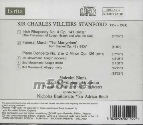 1.LRISH RHAPSODY NO.4 OP.141(1913) (THE FISHERMAN OF LOUGH NEAGH AND WHAT HE SAW) 2.FUNERAL MARCH THE MARTYRDOM FROM BECKET OP.48(1893) PIANO CONCERTO NO.2 IN C MINOR OP.126(1911) 3.1ST MOVEMENT:ALLEGRO MODERATO 4.2ND MOVEMENT:ADAGIO MOLTO 5.3RD MOVEMENT:ALLEGRO MOLTO