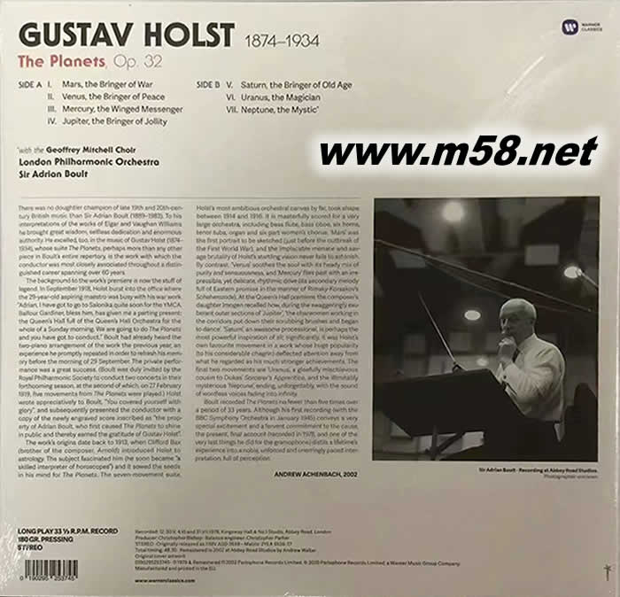 價格為估,以實到貨為準! Holst: The Planets 黑膠(m58.net) 艾爾加:謎語變奏曲;霍爾斯特:行星組曲 / 鮑爾特(指揮) 倫敦交響樂團、倫敦愛樂 ★留聲機雜誌:鮑爾特這份謎語變奏曲的詮釋,點出了這部作品高貴的旨趣所在,但還是保留了音樂本身迷人和興奮的部份…而行星組曲的雄渾演出,可以說是將樂曲作了非常豐沛且不過份虛矯的處理,可以說是將鮑爾特對此作品無人能及的充份認識,作了最頂級的呈現(xiàn)。 霍爾斯特的行星組曲的首演,是在一九一八年九月二十九日在英國的皇后廳,對著兩百五十名由霍爾斯特親自邀請的觀眾所演出的,而指揮這場首演的人,就是英國指揮家鮑爾特。鮑爾特在此曲發(fā)表前一年,就已經(jīng)聽過此曲的雙鋼琴改編版,他本人當然和霍爾斯特私交甚好,也正因為這兩個原因,霍爾斯特在一九一八年九月忽然得知皇后廳在二十九日這天有空檔,樂團也可以演奏時,就特別商請當時才二十九歲,但熟悉這首行星組曲的鮑爾特,為他指揮這場重要的首演,因為當世只有鮑爾特的指揮功力和對此曲的熟稔程度,能讓此曲成功。霍爾斯特對此感激不已,日後還特別將一份新印的樂譜題字送給他,而鮑爾特也就從此成為詮釋此曲的不二人選,在他於一九八三年過世前的六十五年間,始終是此曲的終極代言人。他一生也灌錄此曲不少於五次,第一份錄音是一九四五年完成的,最後一份則是一九七八年完成,也就是您眼前的這份錄音。他將一生指揮此曲的所有經(jīng)驗累積和心得,全都貫注到這份演奏中。 謎語變奏曲也是鮑爾特的獨門絕活,他前後灌錄此曲多達四次,其中第一次是一九三六年完成,最後一次則是一九七零年的錄音,也就是本片。鮑爾特在一九零四年還十五歲時就認識艾爾加本人,當時謎語變奏曲才問世五年的時間,當初俄國首演時還贏得林姆斯基─高沙可夫讚為:布拉姆斯之後最優(yōu)秀的音樂作品。