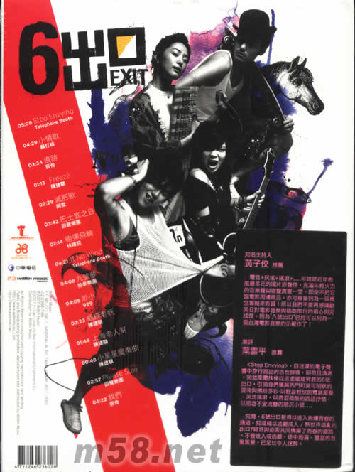 6號出口電影原聲帶(m58.net) 知名主持人 黃子佼 推薦 電音+民搖+搖滾可說是近年曲風最多元的國片原聲帶,充滿年輕火力的音樂聲與歌聲齊聚一堂,即使不把它當電影周邊產品,亦可單單列為一張概念專輯來聆聽!所以我們不要再感嘆歐美日對電影音樂與插曲部分的用心與完成度,因為“六號出口”已經可以為列為一個臺灣電影音樂的示范作了! 樂評 葉云平 推薦 (STOP ENVYING),自迷蒙的電子聲響中穿行而出的吉他線條,明亮且清澈宛如乘電扶梯從底處緩緩升起的6號出口,引領我們橫越西門町莫可明狀的混沌與繽紛多彩以輕盈微酸的西語抒情,以欲念不安流竄的暗沉小號…… 究竟,6與出口是得以進入絢爛青春的通道,抑或借以逃難成人/熟世界煩亂的出口?疑惑與追索共同構成了青春的道路,不管進入或是逃離,途中飽滿、豐富的音樂風景,已足以令代碼迷醉。
