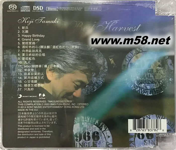完美收成最精選Best Harvest SACD(m58.net) 此張玉置浩二橫跨安全地帶與單飛時期的精選大碟《完美收成》,一共收錄了包括自1993年安全地帶時期譚詠麟曾翻唱過的日本公信榜冠軍單曲《酒紅色的心》、何潤東《陪我去看藍藍的?!吩陡鎰e憂傷》、葉倩文《答案》原曲《夏末的和聲》;1998年《GrandLove》專輯中的同名單曲、美娜化妝品廣告曲《HappyBirthday》;2000年大碟《冒牌情歌》中的《愛慕》、《凡人》等與2001年大碟《黑桃》中之單曲《就用這種方式》、《只為你》、《隨你怎樣都好》等共十七首膾炙人口的單曲。在超值的專輯里重溫玉置浩二細膩的真摯情感,絕對是您不容錯過的經典珍藏!