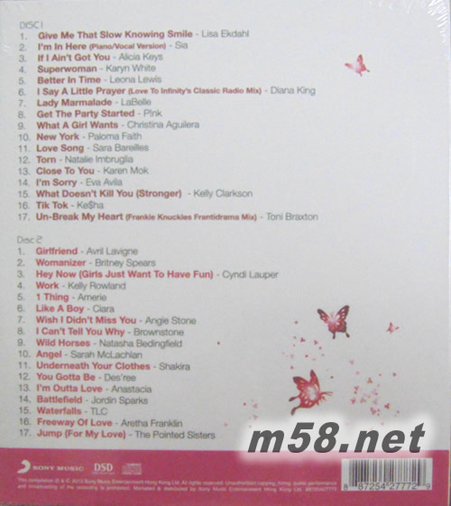 SUPER WOMAN 超級女巨星精選(m58.net) Sony Music推出 全女班雜錦2CD – “Superwoman”, 收錄34首不同音樂風格歌曲, 盡顯現(xiàn)今時代女性不同性格及Girl Power! 包括”盛女大作戰(zhàn)”片頭歌, Diana King – “I Say A Little Prayer”, Alicia Keys – “If I Ain’t Got You”, Karyn White – ‘Superwoman”, Avril Lavigne – “Girlfriend”, Kelly Clarkson – “What Doesn’t Kill You (Stronger)”, Lisa Ekdahl – “Give Me That Slow Knowing Smile” (Canon相機廣告歌), Ke$ha – “Tik Tok”以及P!nk – “Get The Party Started” 等.