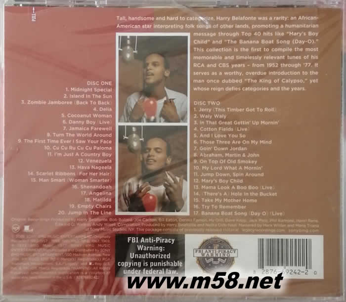THE ESSENTIAL 雙碟(m58.net) 經典靚聲名字Harry Belafonte, 最新2 CD精選”The Essential Harry Belafonte”, 收錄37首成名代表作, 包括”Banana Boat Song (Day O), “Scarlet Ribbons”, “My Lord What A Mornin’”, “Island In the Sun”及”Jamaica Farewell”等. 史無前例地收錄貝拉方提在SONY和BMG精彩的作品。 收錄丹尼男孩、棉花田、香蕉船、黑人靈歌與美國民謠等。