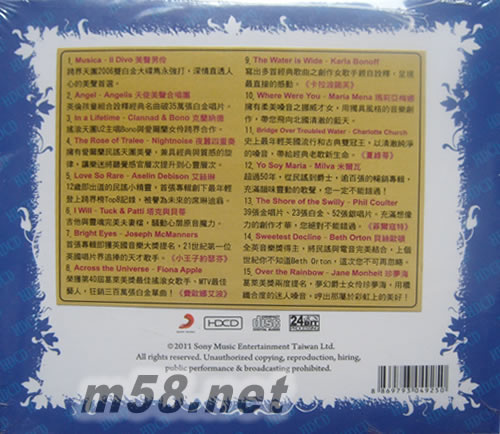 1. Musica –Il Divo 美聲男伶 2. Angel –Angelis 天使美聲合唱團 3. In a Lifetime –Clannad & Bono 克蘭納德 4. The Rose of Tralee –Nightnoise 夜囂四重奏 5. Love So Rare –Aselin Debison 艾絲琳 6. I Will –Tuck & Patti 塔克與貝蒂 7. Bright Eyes –Joseph McManners 小王子約瑟芬 8. Across the Universe –Fiona Apple 費歐娜艾波 9. The Water is Wide –Karla Bonoff 卡拉波諾芙 10. Where Were You –Maria Mena 瑪莉亞梅娜 11. Bridge Over Troubled Water –Charlotte Church 夏綠蒂 12. Yo Soy Maria –Milva 米爾瓦 13. The Shore of the Swilly –Phil Coulter 菲爾寇特 14. Sweetest Decline –Beth Orton 貝絲歐頓 15. Over the Rainbow –Jane Monheit 珍夢海