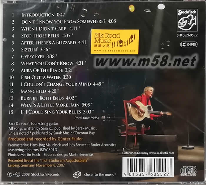 SOLO LIVE Don't I Know You From Somewhere ?(最新現場實況錄音)(m58.net) "老虎魚"最新發燒女聲示範 [莎拉.K最新現場實況錄音] 長達兩年時間的籌備,無數東迷久候.頂級發燒天后.莎拉.K最新專輯終于面世!2007年11月于德國萊比錫的現場實況錄音.莎拉.K使出渾身解數自彈自唱15首出自她筆下的最新作品,她以極溫醇磁性的聲音配合出神入化的吉它演奏技巧,彰顯她在音樂上最攝人的魅力.在無數掌聲,歌聲,吉它聲牽引下,您必能彷如置身現場一樣.親身感受這一場打動人心的音樂會!