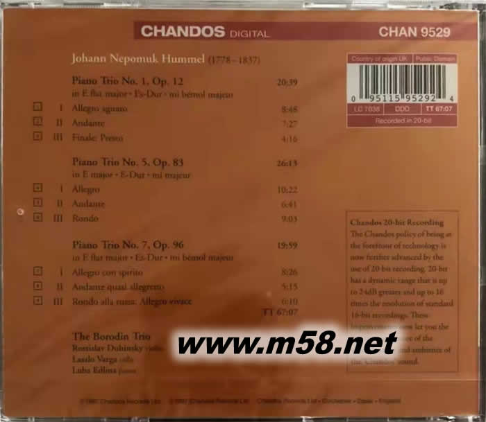 包羅丁三重奏 胡梅爾 HUMMEL PIANO TRIOS 1,5&7 (鋼琴、小提琴、大提琴)(m58.net) THE BORODIN TRIO LUBA EDLINA 鋼琴 ROSTISLAV DUBINSKY 小提琴 YULI TUROVSKY 大提琴 胡梅爾:3首鋼琴三重奏,包羅丁三重奏團。胡梅爾是古典時期重要的作曲家,他是莫扎特的唯一“入室弟子”,在世時聲譽甚至超過與他同時的貝多芬,他的音樂作品有溫磬流暢的旋律、典雅簡潔的樂句、歡快明朗的節奏,豐富精致的積體,讓聆聽者感受到十分美妙的音樂享受。鮑羅丁三重奏團演奏的這個版本獲得高度評價。