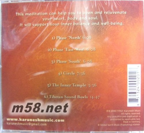 心靈茶伽羅HEART CHAKRA MEDITATN(m58.net) 來自德國New Age名家Karunesh的早期作品(1993),大師級的心靈饗宴! 深奧的東西或許來自藝術家的個體體驗和精神追求,然從更高的層面去理解,如印度哲學、生命科學、瑜伽以及宗教思想等范疇,則chakra有著悠久的傳統和廣泛的影響。