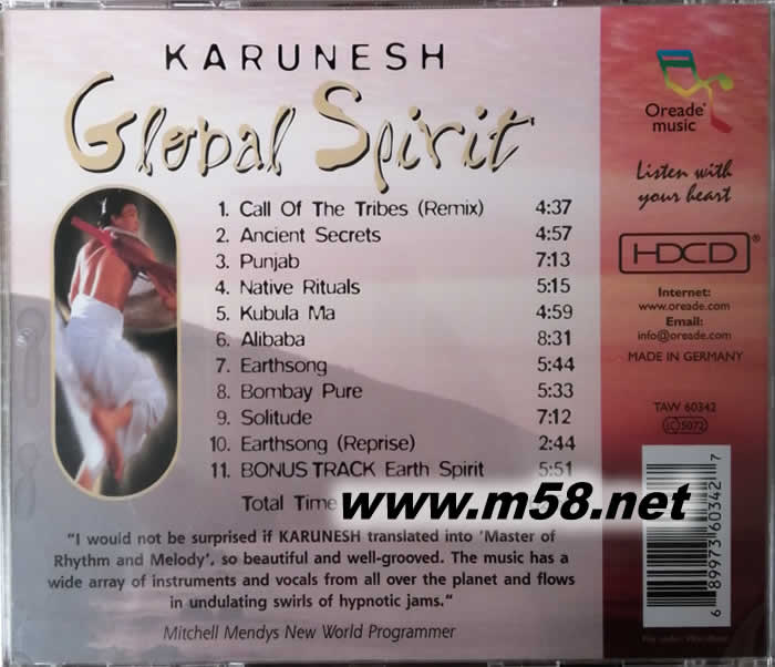 全球音樂精神GLOBAL SPIRIT 新世紀純音樂(m58.net) 這是一張New Age音樂史中里程碑式的作品。大部分新世紀音樂的發燒友們都被它神秘的魔力所吸引。它描述的是古老的神秘部落的故事。 地球上原始土著或者是原住居民的吟唱,那是最樸實無華,最真純的音樂,節奏和連貫是那時音樂的支柱,沒有歌詞,只有低吟,沒有旋律的起伏,只有崇敬自然的反復音節。若沒有現代音樂家去發掘,在自然的籠罩下的詮釋,我們是無法享受的。同樣這張專輯也是一張非常棒的用現代電子樂器糅合進世界各地的民族音樂和樂器,而組成的具有神秘而燦爛的大型樂章! 還記得《世上最動聽的歌曲》中的那首“彭加舞”嗎?就是此碟中的第三首“Punjab”。每每聽到這支曲子時,都會感覺有一個古部落紅衣女子在我面前悠悠的起舞,踏著忽隱忽現的鼓點,眼神中充滿著難以捉摸的神韻。 作者Karunesh于1956出生在德國科隆。他從小就就與音樂結下了不解之緣,并加入了各式各樣的少年樂隊參加了很多演出表演。他修的是圖形設計專業,但卻經常感覺到這不是他生命中真正想期待的東西。在經歷了那場車禍,一場差點讓他喪命的車禍后,他毅然決定放棄他的原有的工作。這次“接近死亡”的經歷被證實成為他生命中靈魂的一次轉折點。Karunesh旅行至印度,他在poona的阿什拉姆(印度教徒隱居地)遇到Osho.正式為自己取了個宗教名字----karunesh,梵文中意為“同情”。 回到德國后Karunesh在漢堡附近的Rajneesh生活了5年。那里為他音樂的發展提供了精神源泉。在那他結識了許許多多來自世界各地的音樂家,把各種文化中不同風格和情感的音樂巧妙的聯系在一起,創作并收錄?lt;Melodies From The Heart>里。那音樂里的氣氛和節奏,會讓你禁不住舞動起來。 1984年,他的第一張專輯發行了,并迅速成為“新古典音樂”市場中銷量最好的一張專輯。而在接接下的一年內,他的另5張專輯也同樣取得了叫好的銷售業績,其中就包括了, 和 。作為第一個把世界音樂緊密融入世紀音樂的藝術家,他的作品贏得了無數的榮譽和尊敬。憑著450000張CD的銷售量,Karunesh確立了自己在世界頂尖NewAge藝術家之間的地位。1992年移居夏威儀。 這是一張當代人所熱衷的專輯,他引導著世界音樂發展的方向。那有著異國情調的節奏和神秘的部落人聲哼唱完美地融合在一起,緊緊地把你的心掏住,讓你體驗了一個鐘頭的環球音樂之旅。