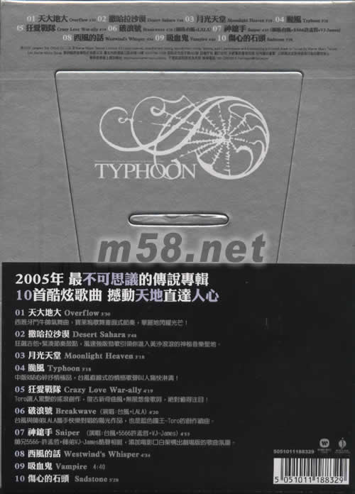 01 天大地大 Overflow 02 撒哈拉沙漠 Desert Sahara 03 月光天堂 Moonlight Heaven 04 臺風 Typhoon 05 狂愛戰隊Crazy Love War-ally 06 破浪號 Breakwave (合唱: LALA) 07 神鎗手 Sniper (feat. 5566-許孟哲+ VJ-James) 08 西風的話 Westwind’s Whisper 09 吸血鬼 Vampire 10 傷心的石頭 Sadstone