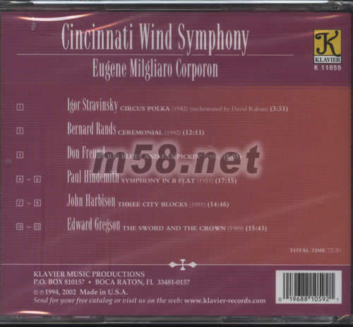 1.LGOR STRAVINSKY CIRCUS POLKA(1942)(ORCHESTRATED BY DAVID R AKSIN) 2.BERNARD RANDS CEREMONIAL(1992) 3.DONFREUND JUG BLUES AND FAT PICKIN'(1986) 4-6.PAUL HINDEMITH STMPHONY IN B FLAT(1951) 7-9.JOHN HARDISON THREE CITY BLOCKS(1991) 10-12.EDWARD GREGSON THE SWORD AND THE CROWN(1989)