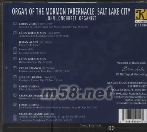 1.LOUIS VIERNE(1870-1937) 2.LEON BOELLMANN(1862-1897) JEHAN ALAIN(1911-1940) 3.LITANIES 4.LE JARDIN SUSPENDU 5.LEON BOELLMANN 6.CESAR FRANCK(1822-1890) 7.MARCEL DUPRE(1886-1971) 8.LOUIS VIERNE 9.CHARLES-MARIE WIDOR(1844-1937) 10.LOUIS VIERNE 11.CHARLES-MARIE WIDOR 12.TOCCATA FROM SYMPHONIE V.OP.42,NO.V