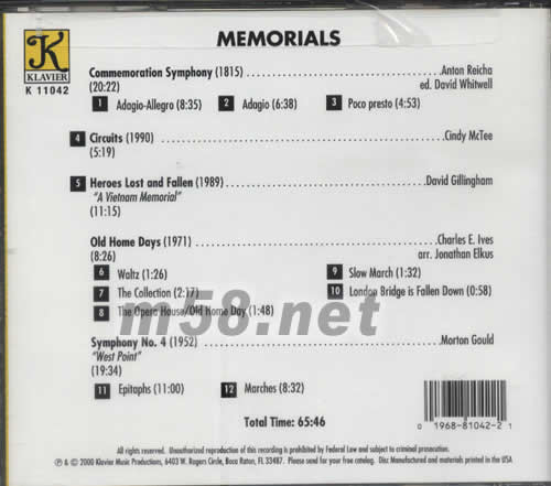 1.ADAGIO-ALLEGRO 2.ADAGIO 3.POCO PRESTO 4.CIRCUITS(1990) 5.HEROES LOST AND FALLEN(1989) A VIETNAM MEMORIAL OLD HOME DAYS(1971 6.WALTZ 7.THE COLLECTION 8.THE OPERA HOUSE/OLD HOME DAY SYMPHONY NO.4(1952) WEST POINT 9.SLOW MARCH 10.LONDON BRIDGE IS FALLEN DOWN 11.EPITAPHS 12.MARCHES