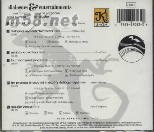 1. EARLY LIQHT(1995) CAROLYN BREMER 2.DIALOQUES AND ENTERTAINMENYTS(1980) EILLIAM KRAFT 2.FRIENDS 3.INTERLUDE 4.HOMAGE ST.MARKS 5.LET NOT THE BLACK SUN DECEIVE YOU 6.MINIATURE OVERTURE(1926) EMST TOCH 7.TIUR MARYLAND SONQS(1995) JACK STAMP 7. ATTHE EDGE OF THE CHOPTANK RIVER TERESA MARIA GOMEZ,SOPRANO 8.A MARYLAND ROAD 9.A FISHERMAN'S SONNET 10.THE SIRES OF SEVENTY-SIX 11.FOR PRECIOUS FUIENDS HID IN DEAFH'S DATELESS NIQHT(1988) MARTIN MAILINAN 11.MOUMFUL HYMNS DID HUSH THE NIGHT TERESA MARIA GOMEZ,SOPRANO 12.BROKEN LOOPS OFBURIED MEMORIES 13.WHICH BY AND BY BLACK NIGHT DOTH TAKE AWAY 14.QAZEBO DANCES(1973) JOHN CORIGLIANO 14.OVERTURE 15.WAKTZ 16.ADAGIO 17.TARANTELLA