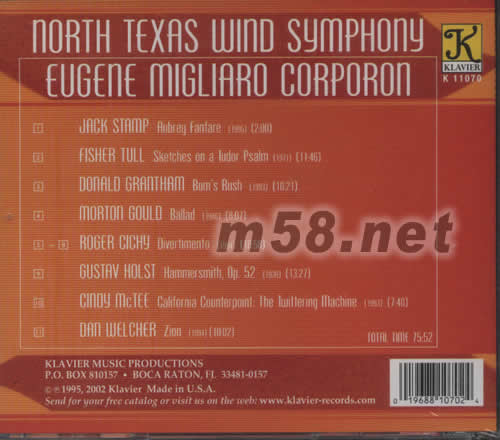 NORTH TEXAS WIND SYMPHONY EUGENE MIGLIARO CORPORON 1.JACK STAMP AUBREY FANFARE 2.FISHER TULL SKETCHES ON A TUDOR PSALM 3.DONALD GRANTHAM BUM'S RUSH 4.MORTON GOULD BALLAD 5-8 ROGER CICHY DIVERTHMENTO 9.GUSTAV HOLST HAMMERSMITH,OP.52 10.CINDY MCTEE CALIFORNIA COUNTERPOINT:THE TWITTERING MACHINE 11.DAN WELCHER ZION