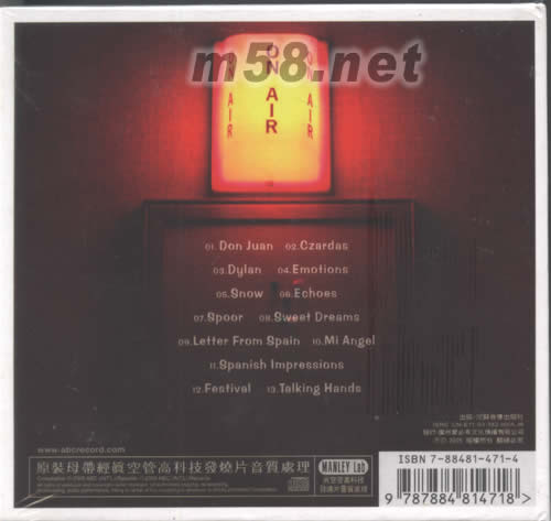 01、 唐璜 3:54 Don Juan 02、 查爾達(dá)斯舞曲 3:47 Czardas 03、 狄倫 3:59 Dylan 04、 情感 4:31 Emotions 05、 雪花 6:21 Snow 06、 回聲 3:39 Echoes 07、 足跡 3:41 spoor 08、 甜美的夢(mèng) 4:13 Sweet Dreams 09、 來自西班牙的信 3:08 Letter From Spain 10、 天使 4:45 Mi Angel 11、 西班牙感想 4:30 Spanish Impressions 12、 節(jié)日 3:38 Festival 13、 手語 4:23 Talking Hands
