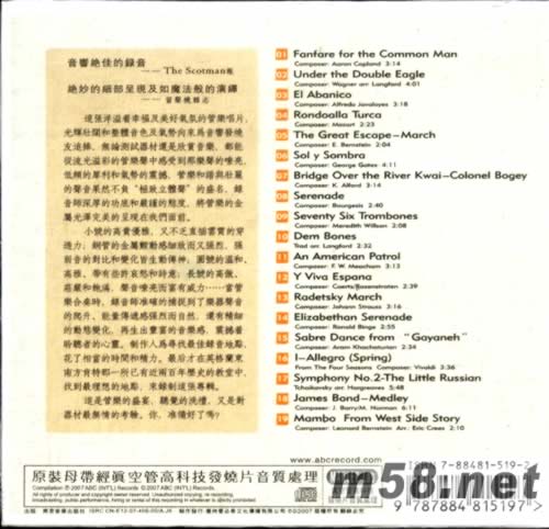 01、 Fanfare for the Common Man Composer: Aaron Copland 02、 Under the Double Eagle Composer: Wagner arr. Langford 03、 El Abanico Composer: Alfredo Javaloyes 04、 Rondoalla Turca Composer: Mozart 05、The Great Escape—March Composer: E. Bernstein 06、Sol y Sombra Composer: George Gates 07、Bridge Over the River Kwai—Colonel Bogey Composer: K. Alford 08、Serenade Composer: Bourgesis 09、Seventy Six Trombones Composer: Meredith Willson 10、Dem Bones Trad arr. Langford 11、 An American Patrol Composer: F. W. Meacham 12、Y Viva Espana Composer: Caerts/Rozenstraten 13、 Radetsky March Composer: Johann Strauss 14、 Elizabethan Serenade Composer: Ronald Binge 15、 Sabre Dance from “Gayaneh” Composer: Aram Khachaturian 16、I—Allegro (Spring) From The Four Seasons Composer: Vivaldi 17、Symphony No.2-The Little Russian Tchaikovsky arr. Hargreaves 18、James Bond—Medley Composer: J. Barry/M. Norman 19、Mambo From West Side Story Composer: Leonard Bernstein Arr.: Eric Crees