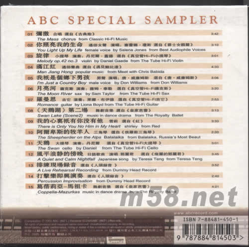 1.彌撒 選自《古典炮》 2.你照亮我的生命 選自《爵士女靚聲》 3.旋律 選自《真空管HI-FI小提琴》 4.滿江紅 選自《遇見鮑比達》 5.我只是個鄉下男孩 選自《唐·威廉姆斯》 6.月亮河 選自《真空管HI-FI薩克斯》 7.羅曼思 選自《真空管HI-FI吉他》 8.《天鵝糊》第二場 選自《皇空芭蕾》 9.我的心里只有你沒有地 選自《紅》 10.阿爾卑斯的牧羊人 選自《俄羅斯三角琴》 11.天鵝 選自《真空管HI-FI大提琴》 12.風平浪靜的傍晚 選自《燦麗的鄧麗君》 13.排練現場錄音 選自《人頭錄音》 14.打擊樂即與演奏 選自《人頭錄音》 15.葛蓓莉亞-馬祖卡 選自《皇家芭蕾》