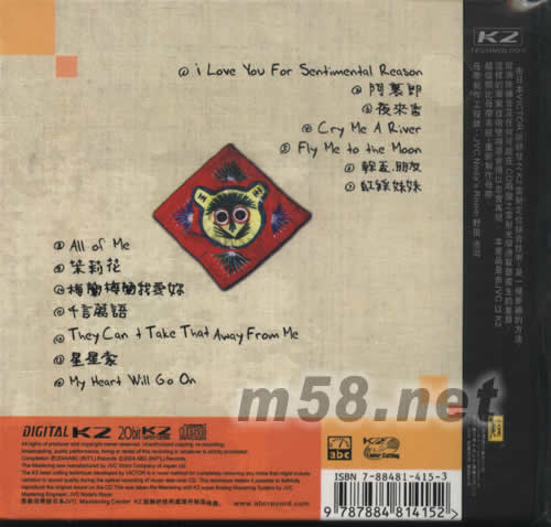 01 I love you sentimental reason 02 阿里郎 03 夜來香 04 Cry me a river 05 Fly me to the moon 06 干杯,朋友 07 虹彩妹妹 08 All of me 09 茉莉花 10 梅蘭梅蘭我愛你 11 千言萬語 12 They can take that away from me 13 星星索 14 My heart will go on