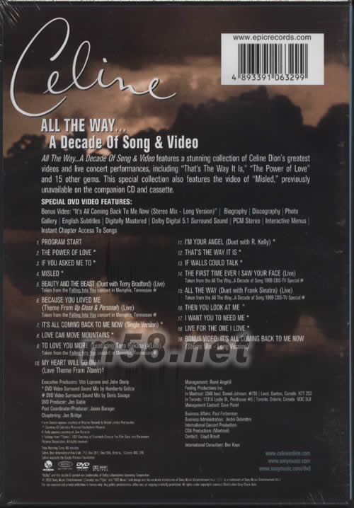 1.PROGRAM START 2.The Power Of Love 3. If You Asked Me To 4. Misled 5. BEAUTY AND THE BEAST 6. Because You Loved Me (Theme From "Up Close & Personal") 7. It's All Coming Back To Me Now 8. Love Can Move Mountains 9. To Love You More 10. My Heart Will Go On 11. I'm Your Angel (Duet With R. Kelly) 12. That's The Way It Is 13. If Walls Could Talk 14. The First Time Ever I Saw Your Face 15. ALL THE WAY 16. Then You Look At Me 17. I Want You To Need Me 18. Live For The One I Love 19.BONUS VIDEO:IT'S ALL COMING BACK TO ME NOW9