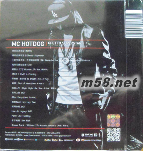 01. 貧民百萬(wàn)歌星 INTRO 02. 貧民百萬(wàn)歌星|Ghetto Superstar 03. 不吃早餐才是一件很嘻哈的事|No Breakfast for Hip~Hoppers(feat. 蛋堡SoftLipa) 04. 和你巧遇在這里SKIT 05. 輕熟女 27|Woman 27(feat. 關(guān)彥淳) 06. MC來(lái)了|MC is Coming 07. 好無(wú)聊|Bored to Death(feat. A-Yue) 08. 離開(kāi)|Out of Here(feat. A-Yue) 09. 嗨嗨人生|High High Life(feat. A-Yue、關(guān)穎) 10. 散場(chǎng)之后SKIT 11. After Party(feat. Scottie) 12. 嘿嘿Taxi |Hey Hey Taxi 13. 新聞快報(bào)SKIT 14. Live @ Legacy SKIT 15. Party Like HotDog 16. 老子有錢|I'm Rich 17. Bonus Track: Woman 27(Acoustic Version)(feat. 關(guān)穎)
