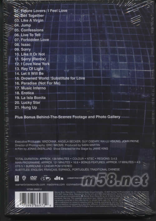 The Confession Tour演唱會DVD DTS版(m58.net) 經過全球39國冠軍,締造逾1千1百萬張銷售紀錄之“Confessions On A Dance Floor”后,于2006年5月21號從美國洛杉磯出發,至9月21號日本東京結束,完成為期四個月共演出60場的“The Confessions Tour”,2007年初,娜姊便獻上此現場的完整影音紀錄,由瑞典藉MV導演Janas Akerlund(羅克塞、羅比威廉斯、克莉絲汀、U2)掌鏡。百變造型的娜姊請到法國作風大膽時尚大師Jean Paul Gaultier,設計秀出四款主題裝扮現身。舞臺前端降下一顆銀白色閃亮發光球體一分為二后,娜姐身著第一套緊身黑色馴馬裝+SM合體改良服開場,唱著新專輯的「Future Lovers」混上情色迪斯科女王Donna Summer經典作「I Feel Love」挑逗出場,緊接著演唱入選專輯全新第三波主攻「Get Together」,高能量電子舞曲聲波釋放出無比引人起舞情緒。熟悉的「Like A Virgin」旋律響起,全場瘋狂的尖叫聲此起彼落,娜姐更坐上舞臺特制電動黑馬,秀出她下半身最柔軟的扭腰擺臀撩人之姿。第二段改以散發游牧民族異國情調服飾,引出經典抒情歌「Live to Tell」,娜姐雙手雙腳如同耶穌般被銬在大型十字架上,背后還散射如太陽光芒般壯麗背景,雖然此舉早已受到羅馬天主教及俄羅斯東正教等宗教團體抨擊為褻瀆神明,然而娜姐之意圖是想喚醒世人關心那些每天要面對死亡恐懼的非洲兒童,盼能引起注意與共鳴。到了暢銷曲「Sorry」時刻,全場樂迷再也按耐不住興奮之情與之大聲唱和盡情狂舞。換上華麗龐克風,黑到發亮的緊身衣褲,娜姊彈著電吉他飆奏高歌「Ray of Light」,拼命喊著臺下樂迷跟著旋律一起跳。第四段的中性且簡單白色套裝,一連帶出耳熟能詳的經典排行舊作「Music」、「Erotica」、「La Isla Bonita」、「Lucky Star」,惹來臺下波波高潮,和舞者們將舞臺搞得跟一場大型嘉年華會般熱鬧,將現場營造出一座大型冰宮似的,舞者穿起溜冰鞋跳著高超炫目舞步來回飛梭,最后穿著粉紅招牌韻律褲引出壓軸「Hung Up」最高熱潮。長達兩個小時令人目不暇給的畫面,滿足觀賞這位流行女王帶給大家影視雙享受的精采饗宴。