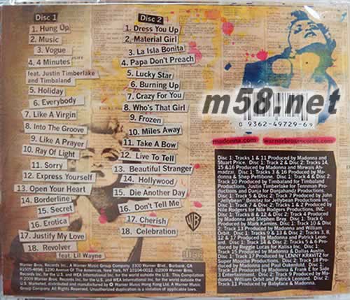 Disc 1 01. Hung Up 02. Music 03. Vogue 04. 4 Minutes 05. Holiday 06. Everybody 07. Like A Virgin 08. Into The Groove 09. Like A Prayer 10. Ray Of Light 11. Sorry 12. Express Yourself 13. Open Your Heart 14. Borderline 15. Secret 16. Erotica 17. Justify My Love 18. Revolver Disc 2 01. Dress You Up 02. Material Girl 03. La Isla Bonita 04. Papa Don't Preach 05. Lucky Star 06. Burning Up 07. Crazy For You 08. Who's That Girl 09. Frozen 10. Miles Away 11. Take A Bow 12. Live To Tell 13. Beautiful Stranger 14. Hollywood 15. Die Another Day 16. Don't Tell Me 17. Cherish 18. Celebration
