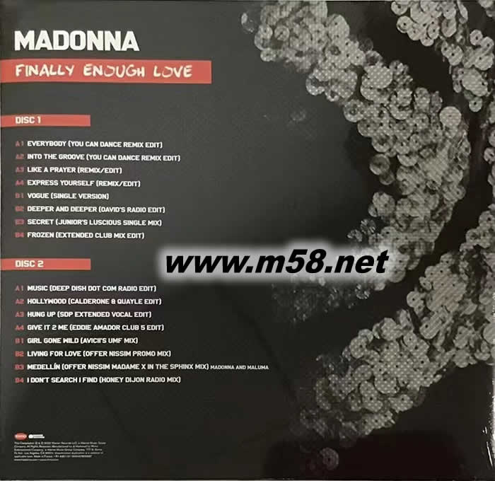 Finally Enough Love 雙黑膠(m58.net) 大破3億超狂數量,成為全球銷售最高的女歌手,美國「搖滾名人殿堂」、英國「音樂名人堂」終身會員,選進告示牌「史上擁有最高巡演票房女藝人」、同時進入VH1頻道「音樂界最偉大女性」、MTV臺「百大藝人」、滾石雜誌「百大創作家」等名單。在80-2010四個不同世代中,「流行女皇」Madonna不僅在音樂上不斷創新與突破,還在穿著打扮以及舞蹈上引領潮流,成為仿效對象。發行過14張錄音室專輯+3張電影原聲帶,全部保送美國流行榜前10強之林,其中9張專輯搶下冠軍寶座!2020年,單曲〈I Don't Search I Find〉讓Madonna獲得生涯第50首告示牌舞曲榜冠軍單曲,立足唯一拿下此榮耀的藝人記錄!為了慶祝此光榮時刻,同時歡迎重回華納唱片懷抱,特別企劃推出混音精選紀念典藏《Finally Enough Love》,帶來一連串舞曲新震撼,橫跨華納和環球時期的作品,此為再精選16首曲目版本。 包括:正式出道的首支單曲〈Everybody〉,2022年慶祝發行40週年,推出12吋單曲黑膠紀念版本,換上全新封面,兩首混音版本全部數位修復;主演電影《神秘約會 Desperately Seeking Susan》重點襯樂〈Into The Groove〉;觸及宗教敏感話題,第一支百萬單曲〈Like A Prayer〉;女權意味頗濃的〈Express Yourself〉,極讚的MV抱回三座MTV大獎肯定,入選滾石雜誌「百大音樂錄影帶」名單;掀起時尚騷動,讓浩室舞風大為流行,引發風尚舞蹈熱潮的〈Vogue〉;增添些許拉丁元素的〈Deeper And Deeper〉;首度嚐試節奏藍調風格的〈Secret〉;電音鬼才William Orbit協助轉型里程碑〈Frozen〉;法國電舞鬼才Mirwais打造新舞風〈Music〉;道出好萊塢明星夢的〈Hollywood〉;喚回復古迪斯可記憶的〈Hung Up〉;提名葛萊美的〈Give It 2 Me〉,身擁13座葛萊美獎喝采的Pharrell Williams攜手撰寫/製作/合聲;變身惡女的夜店尖叫曲〈Girl Gone Wild〉;勇敢追愛主題歌〈Living For Love〉;拉丁新男神Maluma獻藝〈Medellín〉;不僅剪輯〈Vogue〉片段、重回浩室樂全盛精彩時刻,更向歷年舞風做一巡禮的〈I Don't Search I Find〉50首冠軍達標決定曲!