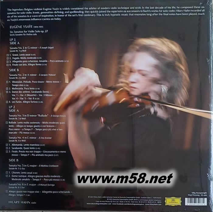 Eugène Ysaÿe: Six Sonatas for Violin Solo op. 27 雙黑膠 (DG唱片125周年紀念版)(m58.net) Eugène Ysaïe的小提琴獨奏六首奏鳴曲的新錄音,作品27。受兩個世紀前J.S.巴赫樹立的榜樣的啟發,比利時傳奇小提琴家兼作曲家Eugène Ysaïe于1923年6月創作了第一首六奏鳴曲。一百年后,希拉里·哈恩(Hilary Hahn)“我們這個時代最重要的小提琴家之一”(《紐約時報》)在即將到來的百年誕辰的推動下,以她自己的靈感浪潮錄制了這一場景,以實現她的一個夢想項目。 哈恩說:“我為自己的好運感到驚訝,因為我繼承了伊莎伊的藝術遺產。”。“20年前,這些作品感覺很抽象,好像它們蘊藏著我永遠不會知道的秘密。現在,伊莎伊奏鳴曲對我來說很自然,好像我已經以某種方式成長為它們了。”