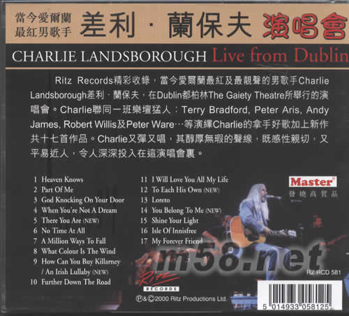 價格為估,以實到貨為準! 都柏林演唱會(m58.net) 請點看產品正、背面大圖 這位愛爾蘭的當今最紅及最靚聲的男歌手差利.蘭保夫,在都柏林索舉行的演唱會的現場錄音,其純厚的聲線,感性而親切,令人深深投入這個演唱會里面。由于錄音非常好,所以現場感一流