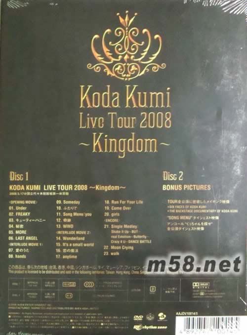 KODA KUMI LIVE TOUR 2008 KINGDOM(香港初回限定版DVD)(m58.net) 全國14萬人を動員した“KODA KUMI LIVE TOUR 2008~Kingdom~”が待望のDVD化! 前回の“Black Cherry TOUR”同様、ストーリー仕立ての內容は大迫力のオープニング映像に始まり、1幕ではワイヤーアクション、2幕ではアリーナから至近距離の花道パフォーマンス、3幕ではキュートな世界観を演出するなど、各幕にそれぞれ驚きの演出とパフォーマンスが盛り込まれた、エンタテインメント性に富んだ完成度の高いLIVEパフォーマンスになっています! 更に、DICS-2には特典映像を約60分収録した豪華2枚組LIVE DVD!