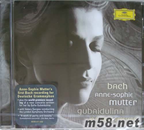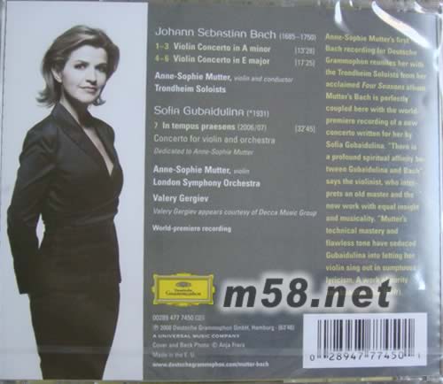 BACH Violin Concerto No.1-2 巴哈 第一 二號(hào)小提琴協(xié)奏曲(m58.net) 特首次巴哈錄音 慕特,小提琴、指揮特隆赫姆獨(dú)奏家樂團(tuán)/葛濟(jì)夫指揮倫敦交響樂團(tuán) 乍看之下,這張專輯的曲目非常突兀:巴洛克時(shí)期的巴哈搭配俄羅斯現(xiàn)代女作曲家古拜都琳娜題獻(xiàn)給慕特的小提琴協(xié)奏曲《當(dāng)下》。事實(shí)上,樂曲的搭配相當(dāng)巧妙:因?yàn)榘凸淖髌芬幌蚴枪虐荻剂漳鹊膭?chuàng)作靈感。在慕特的詮釋下,愛樂者可以從全新的現(xiàn)代角度來(lái)審視巴哈的作品,并且想像假如巴哈身處現(xiàn)代背景,可能會(huì)出現(xiàn)什麼樣的創(chuàng)作方向。 古拜都琳娜第二號(hào)小提琴協(xié)奏曲《當(dāng)下》創(chuàng)作於2006年至2007年間,由慕特在2007年的瑞士琉森音樂節(jié)中首演,2008年初與葛濟(jì)夫、倫敦交響樂團(tuán)錄製。為了突顯出獨(dú)奏,古拜都琳娜刪去樂團(tuán)的小提琴編制,配器相當(dāng)巧妙,由大鍵琴與打擊樂器搭配華格納低音號(hào),讓音色不至過(guò)於單調(diào),抒情的長(zhǎng)旋律給了慕特非常大的詮釋空間。而在巴哈的作品裡,慕特再度與當(dāng)年合作維瓦第《四季》而且廣受好評(píng)的年輕團(tuán)體特隆赫姆獨(dú)奏家樂團(tuán)聯(lián)手,打造出別出心裁的現(xiàn)代巴哈。