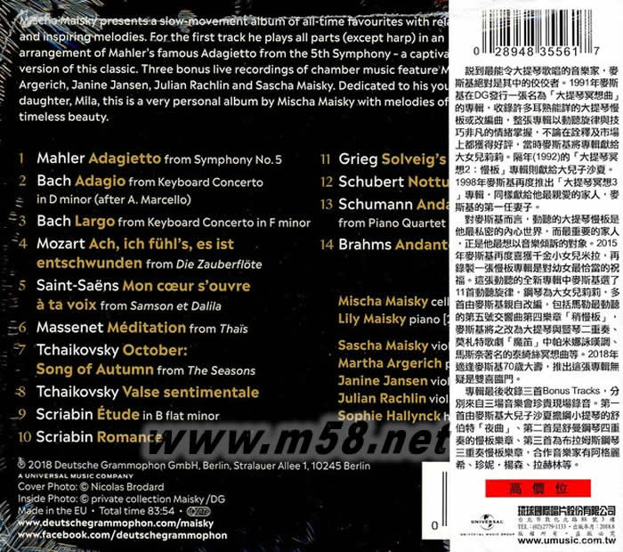 大提琴冥想 慢板再現 Adagietto(m58.net) 大提琴/米夏‧麥斯基 ☆鋼琴/莉莉‧麥斯基、阿格麗希 ☆小提琴/沙夏‧麥斯基、珍妮‧楊森 ☆中提琴/朱里安‧拉赫林 ☆豎琴/蘇菲‧哈林克 ◎麥斯基70大壽紀念專輯 ◆獻給幼女Mila的私密祝福 ◎麥斯基70大壽紀念專輯 ◆獻給幼女Mila的私密祝福 說到最能令大提琴歌唱的音樂家,麥斯基絕對是其中的佼佼者。1991年麥斯基在DG發行一張名為「大提琴冥想曲」的專輯,收錄許多耳熟能詳的大提琴慢板或改編曲,整張專輯以動聽旋律與技巧非凡的情緒掌握,不論在詮釋及市場上都獲得好評,當時麥斯基將專輯獻給大女兒莉莉。隔年(1992)的「大提琴冥想2:慢板」專輯則獻給大兒子沙夏。1998年麥斯基再度推出「大提琴冥想3」專輯,同樣獻給他最親愛的家人,麥斯基的第一任妻子。 對麥斯基而言,動聽的大提琴慢板是他最私密的內心世界,而最重要的家人,正是他最想以音樂傾訴的對象。2015年麥斯基再度喜獲千金小女兒米拉,再錄製一張慢板專輯是對幼女最恰當的祝福。這張動聽的全新專輯中麥斯基選了11首動聽旋律,鋼琴為大女兒莉莉,多首由麥斯基親自改編,包括馬勒最動聽的第五號交響曲第四樂章「稍慢板」,麥斯基將之改為大提琴與豎琴二重奏、莫札特歌劇「魔笛」中帕米娜詠嘆調、馬斯奈著名的泰綺絲冥想曲等。2018年適逢麥斯基70歲大壽,推出這張專輯無疑是雙喜臨門。 專輯最后收錄三首Bonus Tracks,分別來自三場音樂會珍貴現場錄音。第一首由麥斯基大兒子沙夏擔綱小提琴的舒伯特「夜曲」、第二首是舒曼鋼琴四重奏的慢板樂章、第三首為布拉姆斯鋼琴三重奏慢板樂章,合作音樂家有阿格麗希、珍妮‧楊森、拉赫林等。 說到最能令大提琴歌唱的音樂家,麥斯基絕對是其中的佼佼者。1991年麥斯基在DG發行一張名為「大提琴冥想曲」的專輯,收錄許多耳熟能詳的大提琴慢板或改編曲,整張專輯以動聽旋律與技巧非凡的情緒掌握,不論在詮釋及市場上都獲得好評,當時麥斯基將專輯獻給大女兒莉莉。隔年(1992)的「大提琴冥想2:慢板」專輯則獻給大兒子沙夏。1998年麥斯基再度推出「大提琴冥想3」專輯,同樣獻給他最親愛的家人,麥斯基的第一任妻子。 對麥斯基而言,動聽的大提琴慢板是他最私密的內心世界,而最重要的家人,正是他最想以音樂傾訴的對象。2015年麥斯基再度喜獲千金小女兒米拉,再錄製一張慢板專輯是對幼女最恰當的祝福。這張動聽的全新專輯中麥斯基選了11首動聽旋律,鋼琴為大女兒莉莉,多首由麥斯基親自改編,包括馬勒最動聽的第五號交響曲第四樂章「稍慢板」,麥斯基將之改為大提琴與豎琴二重奏、莫札特歌劇「魔笛」中帕米娜詠嘆調、馬斯奈著名的泰綺絲冥想曲等。2018年適逢麥斯基70歲大壽,推出這張專輯無疑是雙喜臨門。 專輯最后收錄三首Bonus Tracks,分別來自三場音樂會珍貴現場錄音。第一首由麥斯基大兒子沙夏擔綱小提琴的舒伯特「夜曲」、第二首是舒曼鋼琴四重奏的慢板樂章、第三首為布拉姆斯鋼琴三重奏慢板樂章,合作音樂家有阿格麗希、珍妮‧楊森、拉赫林等。