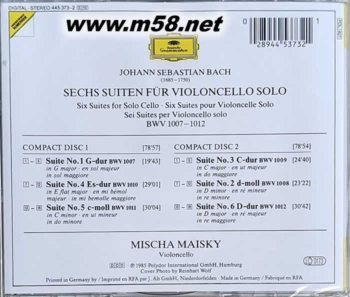 6 SUITES FOR SOLO CELLO BWV 1007-1012 大提琴組曲(m58.net) 這套《巴赫:大提琴奏鳴曲》由DG唱片公司發行于1985年,瑪莎?阿格麗齊和米莎?麥斯基共同演奏錄制,內收錄了巴赫創作的三首大提琴奏鳴曲。 瑪莎?阿格麗齊(Martha Argerich,1941-)是少數真正屬于天才型的鋼琴演奏家。1941年6月5日生于阿根廷布宜諾艾麗斯,父親是外交官,她三歲開始學琴,八歲和布宜諾艾麗斯管弦樂團同臺演出,一鳴驚人。阿格麗齊在當地跟隨鋼琴大師古爾達學了一年半,古爾達也是樂壇怪胎,經常不按常理出牌,但對阿格麗齊無論在人格及技巧上意義重大,俱深遠影響。1965年在華沙肖邦鋼琴大賽中得獎。阿格麗齊的專長在室內樂及詮釋李斯持、舒曼、拉威爾、斯特拉汶斯基等人作品。阿格麗齊是一個持續處于巔蜂狀態的演奏家。她的演奏熱情如火,并很好地結合了作品的抒情性與高超的技巧,清晰明亮的琴聲把節奏自由的抒情片段表現得盡善盡美。 米莎?麥斯基(Mischa Maisky)是當今除羅絲特洛波維奇和馬友友之外最富盛譽的演奏大師之一,他的演奏往往突出亮麗的效果,琴音富有變化。他出生于1948年1月10日,受熱愛音樂的母親及哥哥姐姐的影響,麥斯基8歲時迷上大提琴,17歲時贏得全蘇大提琴比賽頭獎,翌年獲柴科夫斯基音樂比賽大提琴項目的金牌。麥斯基的世界性演奏生涯始自1975年。許多世界矚目的音樂節和慶典上均傳出他美妙的琴音。麥斯基的演奏既有傳統的延伸,又有他獨具的特色,其技巧圓熟、熱情、細膩;音色醇朗、潤澤、柔美,尤其富于歌唱性。羅斯特羅波維奇稱贊麥斯基為:“年輕一代大提琴家中最杰出的天才之一。他的演奏融詩意、優雅的精致與高貴的氣質和輝煌的技巧于一體?!?br>作為德意志唱片公司專屬的藝術家,米莎?麥斯基是第一位為這杰出的品牌錄制了巴赫的全部大提琴作品。他的唱片在世界范圍受到評論家的稱贊,在東京三次榮獲唱片學術獎,在巴黎獲人人渴望的唱片大獎。除錄制巴赫的獨奏組曲,米莎?麥斯基與瑪莎?阿格里奇莫錄制了巴赫、舒伯特、弗朗克、德彪西以及貝多芬的全套大提琴協奏曲和變奏曲。麥斯基的錄音還包括埃爾加的《大提琴協奏曲》、與愛樂樂團和西諾波利合作的柴科夫斯基的《羅可可變奏曲》,這張唱片在東京獲得享有威望的唱片學術獎。他錄制的小品選集《沉思》、《柔板》和《大提琴精萃》被評為最暢銷的唱片。