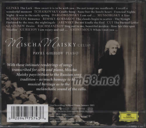 WITH THESE INTIMATE RENDEINGS OF SONGS TRANSCRIBED FOR CELLO AND PIANO,MISCHA MAISKY PAYS TRIBUTE TO THE RUSSIAN SONG TRADITION-AS MUCH HOMAGE TO HIS MUSICAL HERITAGE AS TO THE MELANCHOLIC SOUND OF THE CELLO