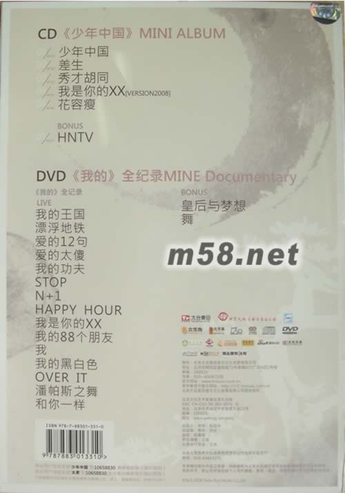 CD《少年中國》MINI ALBUM 01. 少年中國 02. 差生 03. 秀才胡同 04. 我是你的XX[VERSION2008] 05. 花容瘦 BONUS 01. HNTV DVD《我的》全紀錄MINE Documentary 《我的》全紀錄 LIVE 我的王國 漂浮地鐵 愛的12句 愛的太傻 我的功夫 STOP N+1 HAPPY HOUR 我是你的XX 我的88個朋友 我 我的黑白色 OVER IT 潘帕斯之舞 和你一樣 BONUS 皇后與夢想 舞
