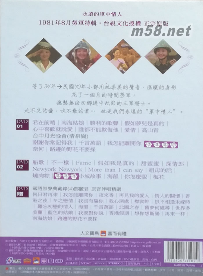 DVD-1 君在前哨│南海姑娘│勝利的歌聲│假如夢兒是真的│心中喜歡就說愛│ 誰都不能欺侮他│愛情│高山青 臺中月光晚會(清泉崗) 謝謝你常記得我│千言萬語│我怎能離開你│你在我心里│奈何│路邊的野花不要採 DVD-2 船歌│不一樣│Fame│假如我是真的│甜蜜蜜│探情郎│Newyork Newyork│ More than I can say│祖母的話│燒肉粽│原鄉人│小城故事│海韻│你怎么說│梅花 DVD-3 國語原聲典藏錄(4)鄧麗君 原音伴唱精選 何日君再來│我怎能離開你│夜來香│再見我的愛人│情人的關懷│香港之夜│冬之戀情│我沒有騙你│我心深處│襟裳岬│恨不相逢未嫁時│難忘初戀的情人│海韻│千言萬語│北國之春│舊夢何處尋│世界多美麗│藍色的姑娘│我要對你說│香港假期│想你想斷腸│再來一杯│南海姑娘│路邊的野花不要採