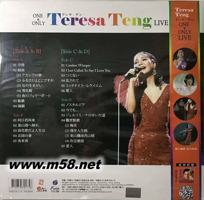 鄧麗君 NHK1985東京演唱會 2LP 雙黑膠 彩膠 限量版(m58.net) 1985年是鄧麗君在日本歌唱事業(yè)達(dá)到最高峰,單曲《愛人》在日本廣播排行上締造了蟬聯(lián)十周冠軍的輝煌紀(jì)錄,同時(shí)這個(gè)階段也是鄧麗君唱功最爐火純青的黃金階段。此LIVE-2LP完整收錄包含安可曲。鄧麗君在日本唯一的一場One And Only演唱會,也是歌迷永遠(yuǎn)的One And Only。