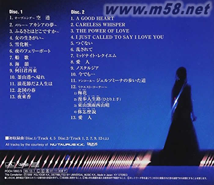 1] (1)開放~機場 (2)混合:金合歡的夢~ (3)故鄉(xiāng)在哪里~? (4)女人的生活意義~ (5)銀裝~ (6)晚上的渡船 (7)船歌 (8)海韻 (9)幾號你再來(hooriichuintsuairai) (10)回釜山港 (11)是浪花曲,人生 (12)北國的春天 (13)晚上的來香(ieraishiian) [2] (1)A GOOD HEART (2)CARELESS WISPER (3)THE POWER OF LOVE (4)I JUST CALLED TO SAY I LOVE YOU (5)倒沒有 (6)被擾亂 (7)午夜·安魂 (8)情人 (9)鄉(xiāng)愁 (10)現(xiàn)在還… (11)再演一次~jierusomina的走路的道路 (12)要求·角:梅花(meihoua)~漫步人生路(mampuurenshionruu)(一個人高處)~東山飄雨西山晴(tuonshianhiaoeishiishianchin)~〓怎縻説(niitsuemmooshiuo) (13)情人